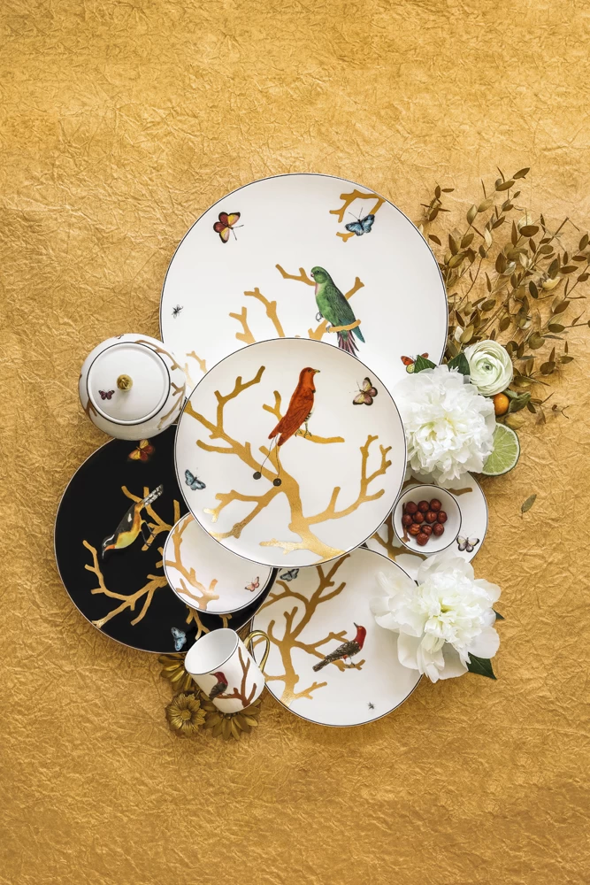The Aux Oiseaux collection was inspired by the curiosity cabinets that were fashionable in the 16th and 17th centuries. Reminiscent of Japanese prints, colorful birds perch on stylized trees in raised gold.