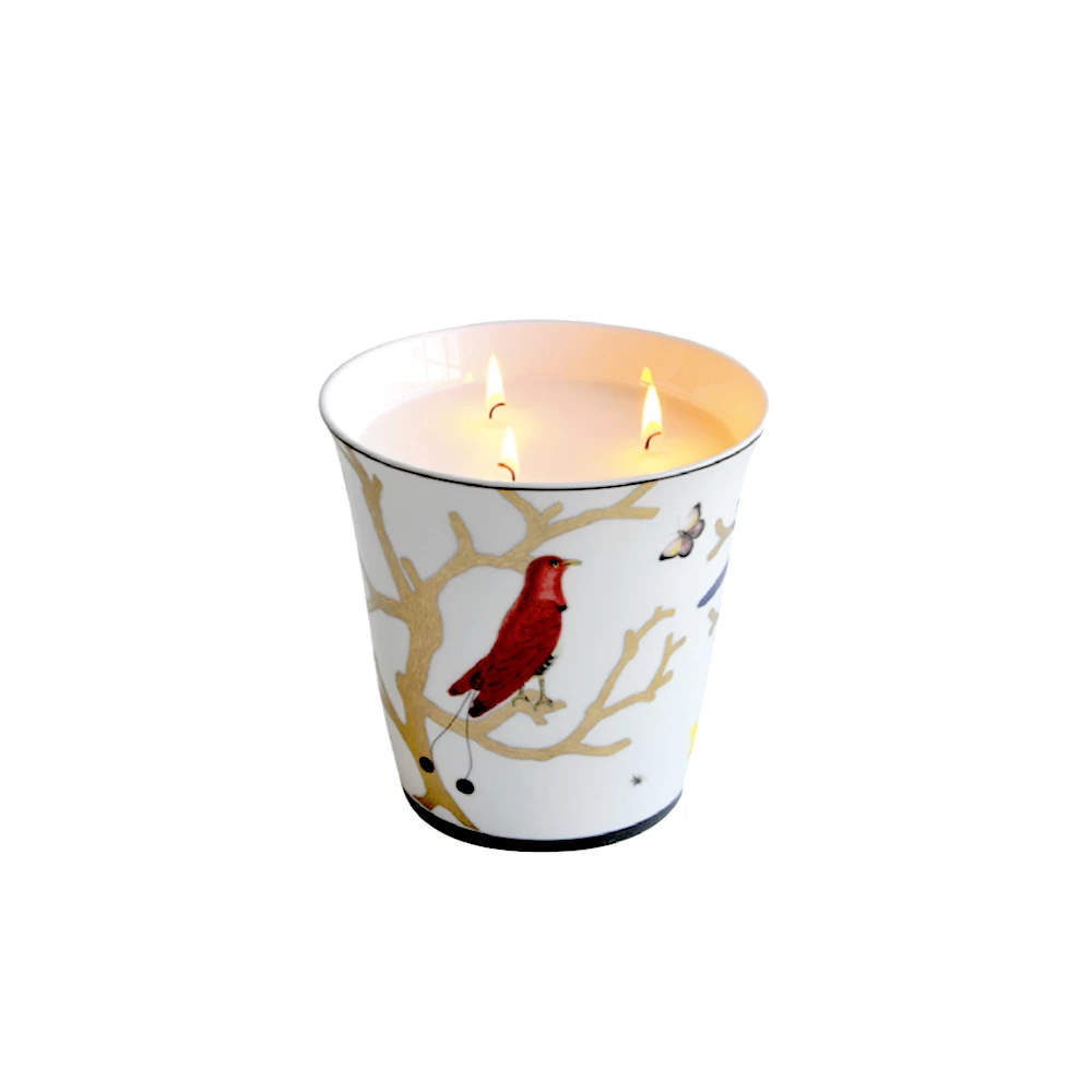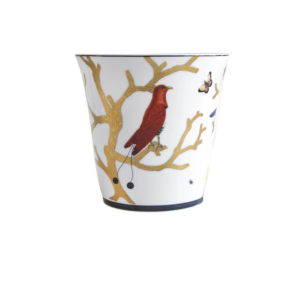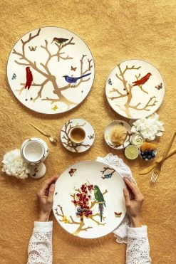 The Aux Oiseaux collection was inspired by the curiosity cabinets that were fashionable in the 16th and 17th centuries. Reminiscent of Japanese prints, colorful birds perch on stylized trees in raised gold.