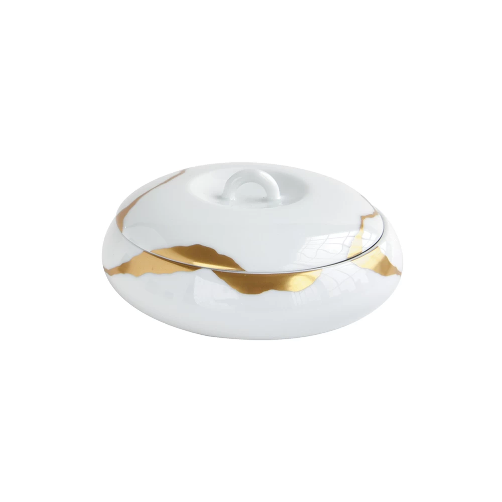 Kintsugi, the art of making visible repairs on fired ceramic using a mix of lacquer and gold. By using golden joinery, the breakage is highlighted as part of the object’s history, rather than something to hide. The artist Sarkis used his fascination of this 16th-century Japanese technique to create this collection with Bernardaud.