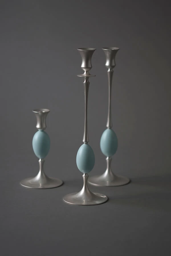 In this collection of Biedermeier candlesticks with a satin silver finish, elements of classic European design get updated and reconfigured into something timeless. This particular style is made even more striking by a contrasting egg in robin’s egg blue. Available in four finishes and three distinctive shapes. Please contact us for information and pricing.