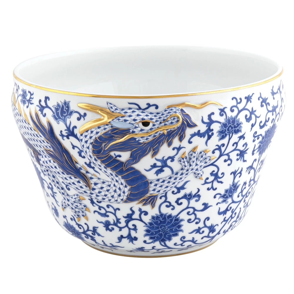 The Herend Dragon Cachepot is an homage to Chinese dynasties of the past represented through a modern composition. Featuring a hand-painted dragon whoβs serpentine body wraps around its surrounding flora. Finished with gold detailing and a gold rim. This porcelain cachepot is a limited edition of 75.
