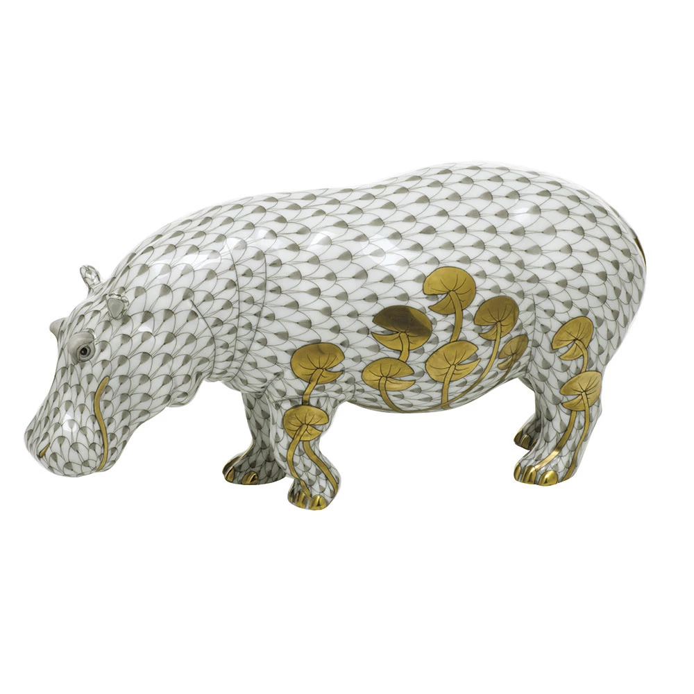 The Herend Hippopotamus features the iconic fishnet design in grey with the addition of golden Lily pads. This fishnet design originated in 1858, becoming one of Herend’s most historic and recognizable motifs. This porcelain figurine is a limited edition of 150.