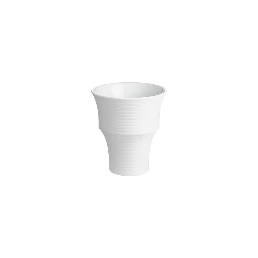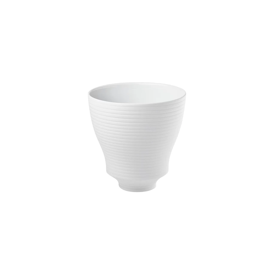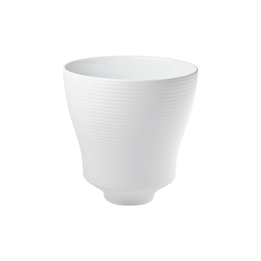 The sleek tranquility of this collection reveals, upon closer examination, a pattern of concentric rings, radiating outward to give each piece a subtle intrigue. Selected accent pieces adjust the frequency, with parallel lines or grid motifs. White bisque porcelain with glazed center. Dishwasher and microwave safe.