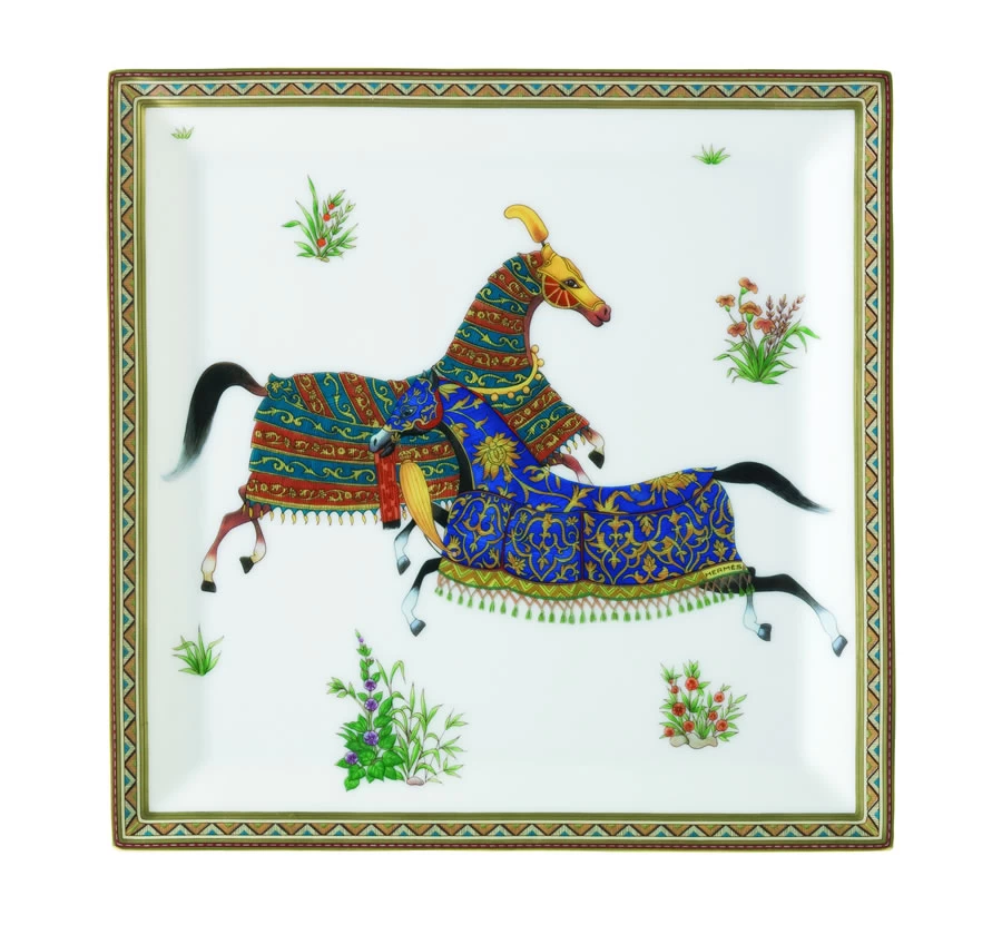 Based on the intricacy and refinement of Persian miniatures, the Cheval d’Orient collection is resplendent in colors and equestrian motifs richly evocative of Silk Road caravans, with adornments such as geometric borders inspired by the braiding on Arab saddle cloths. While opulent, this collection has been executed with a light touch, a fineness that keeps it from overpowering. Its splendor is instead the kind that draws you in, for a sophisticated allure that will complement any table. Limoges porcelain. Dishwasher safe.