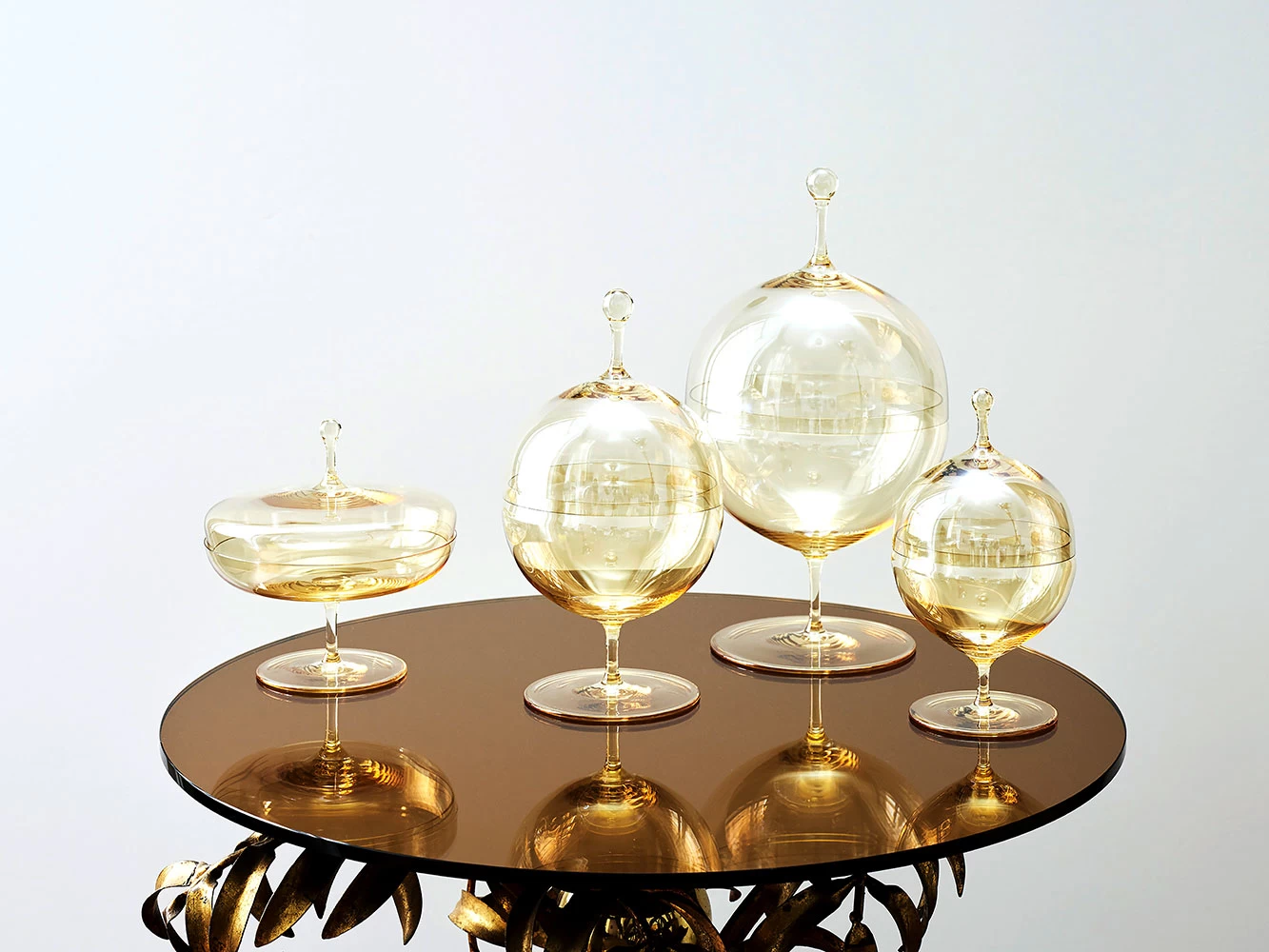 Lobmeyr’s iconic spherical candy dish epitomizes simple but striking design. This new gold-tinted muslin glass is a twist on the original mouth-blown classic giving the piece’s provocatively forward look a soft-glowing golden hue.