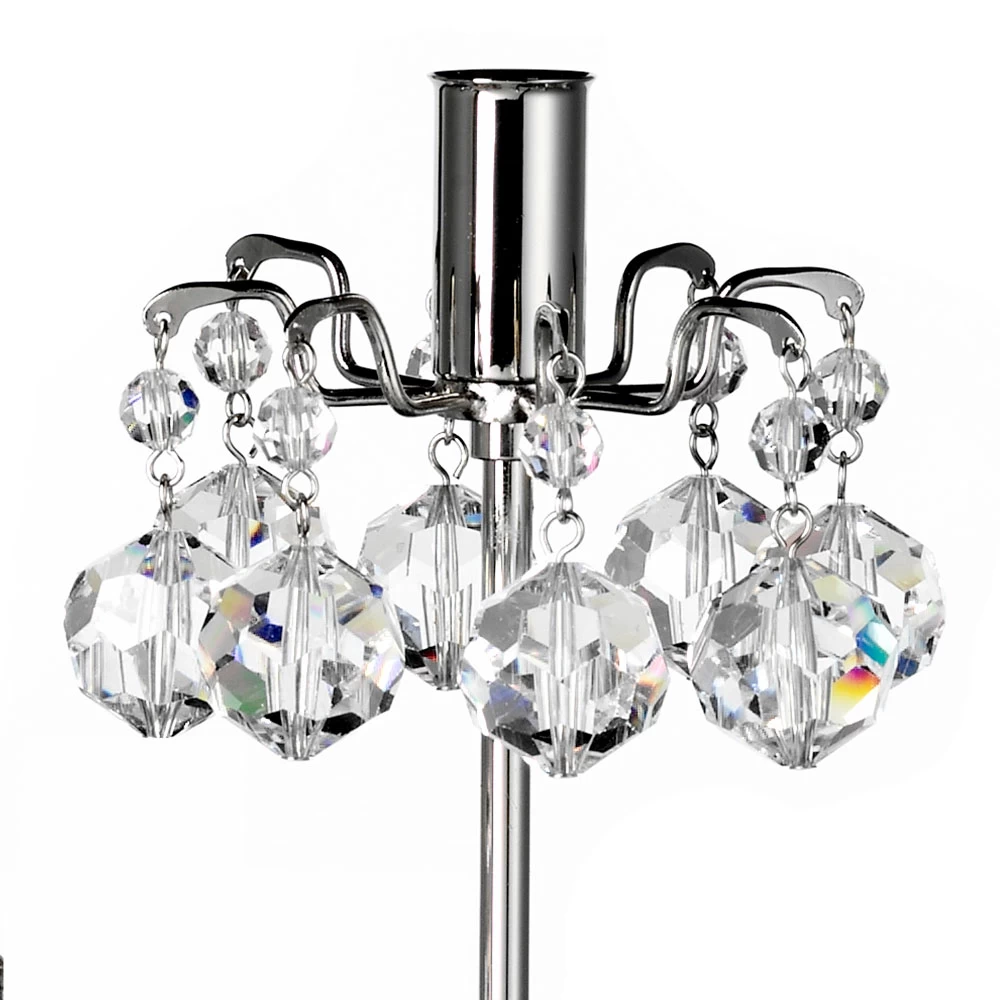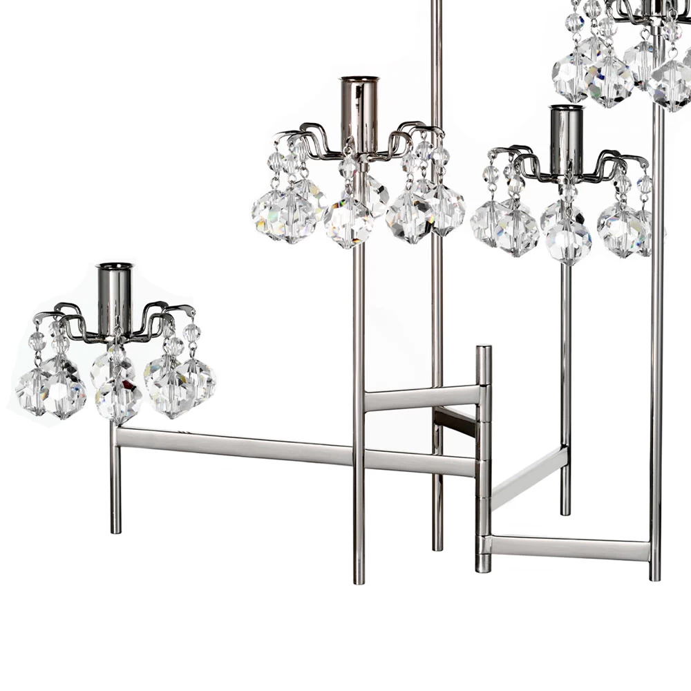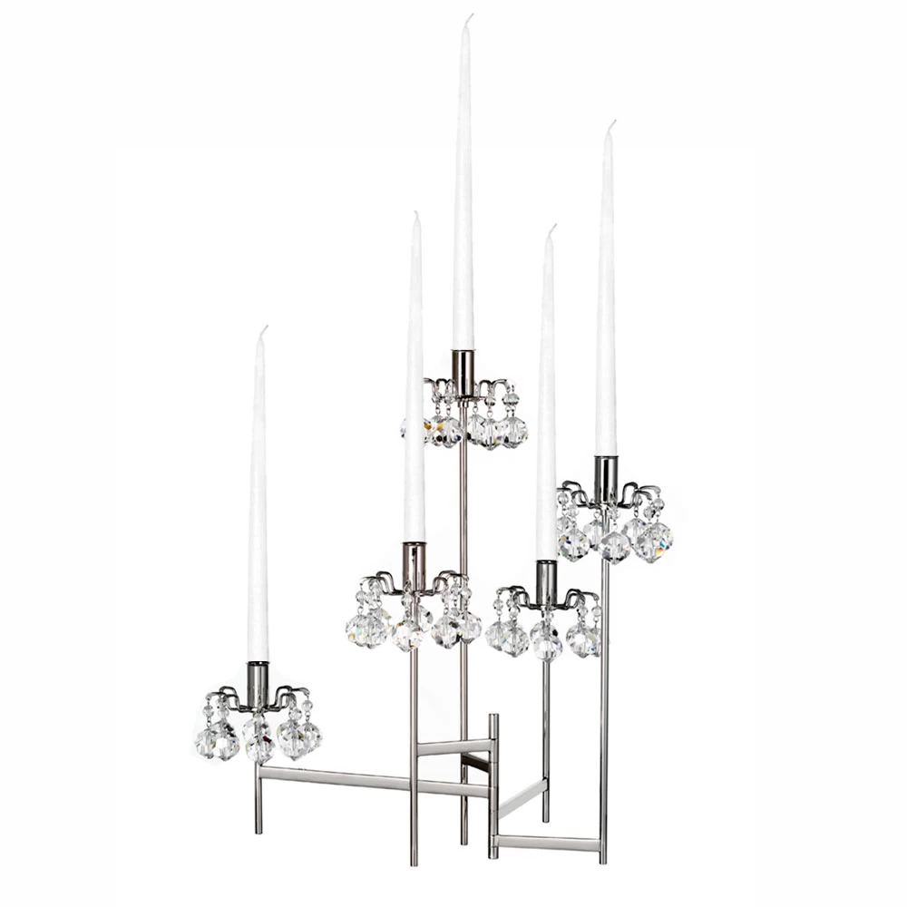 These candlesticks feature gently arcing arms holding crystal pendants and forming close, brilliant coronas around simple, unadorned stems. Swarovski crystal beads five arm candelabrum with nickel plated brass bobeches and spoke base, inspired by wreath designs.