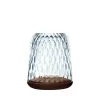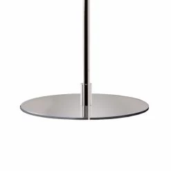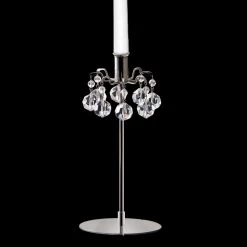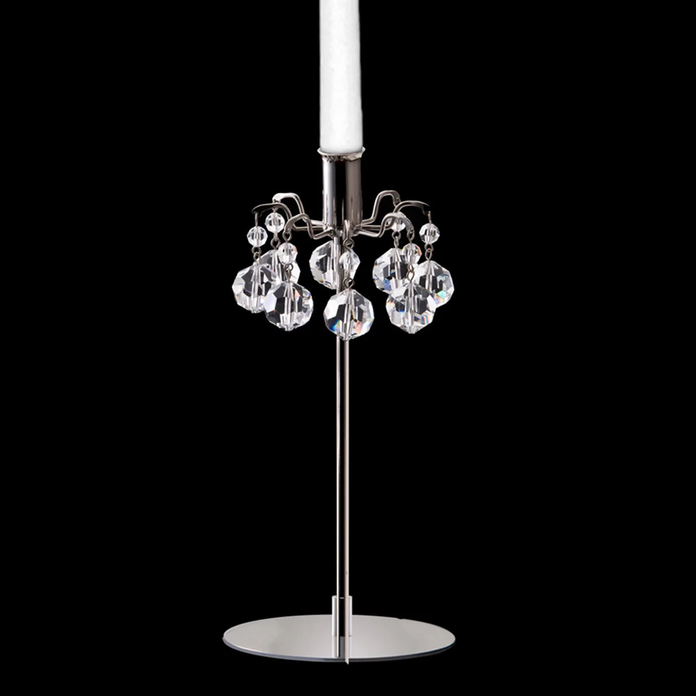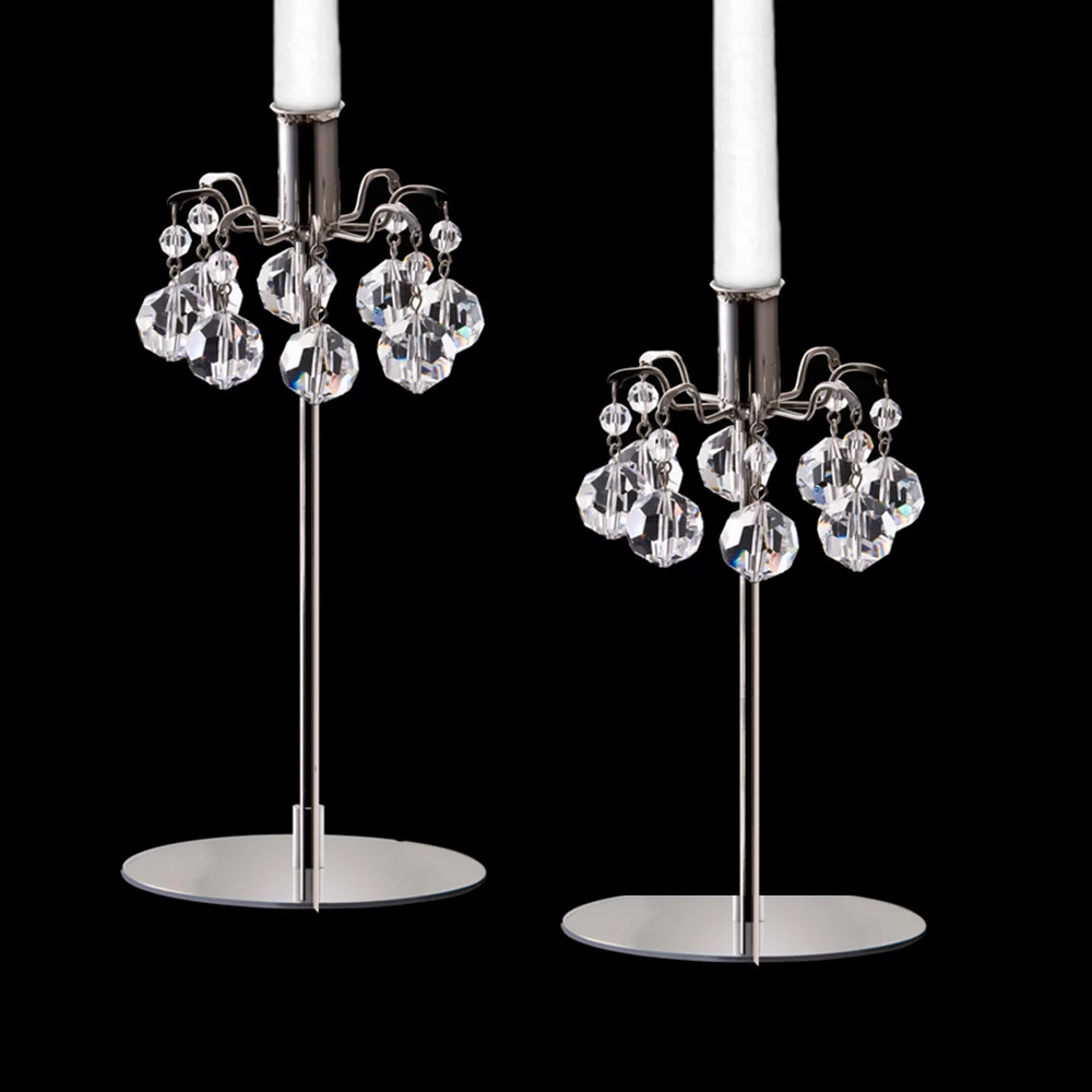 These candlesticks feature gently arcing arms holding crystal pendants and forming close, brilliant coronas around simple, unadorned stems. Crystal and Swarovski crystal beads candlestick with nickel plated brass bobeches and shaped stand, inspired by wreath designs