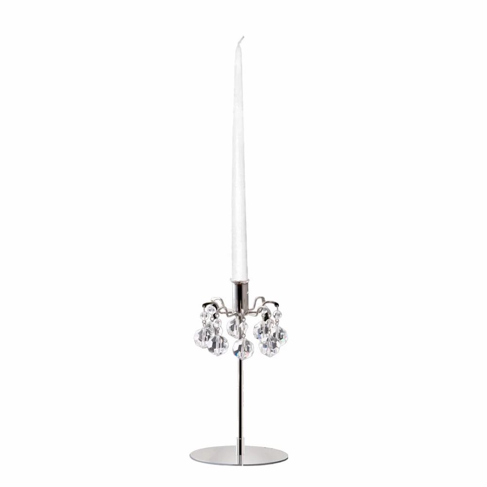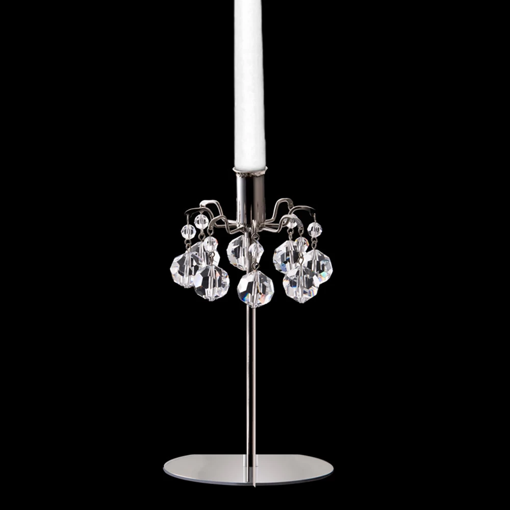 These candlesticks feature gently arcing arms holding crystal pendants and forming close, brilliant coronas around simple, unadorned stems. Crystal and Swarovski crystal beads candlestick with nickel plated brass bobeches and shaped stand, inspired by wreath designs