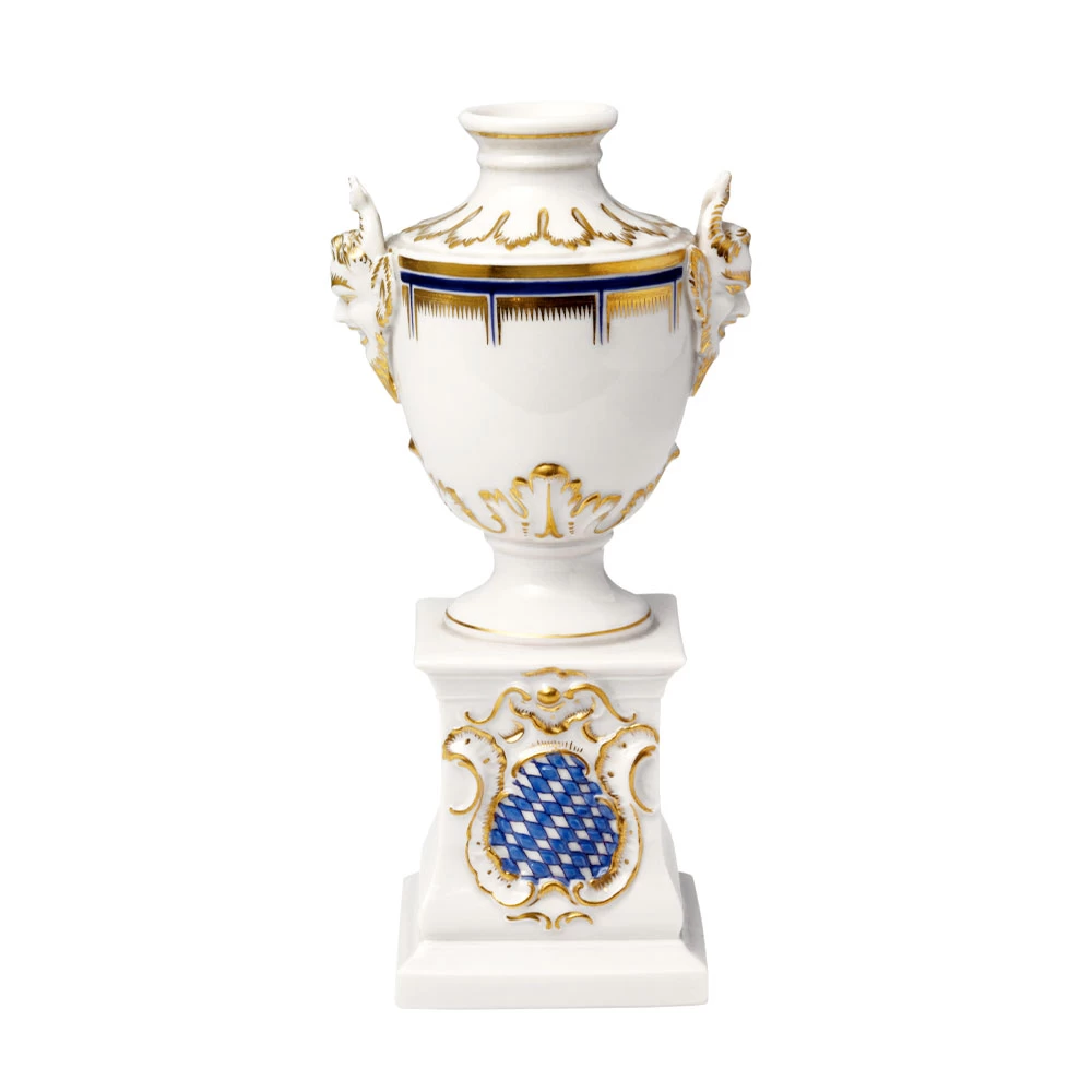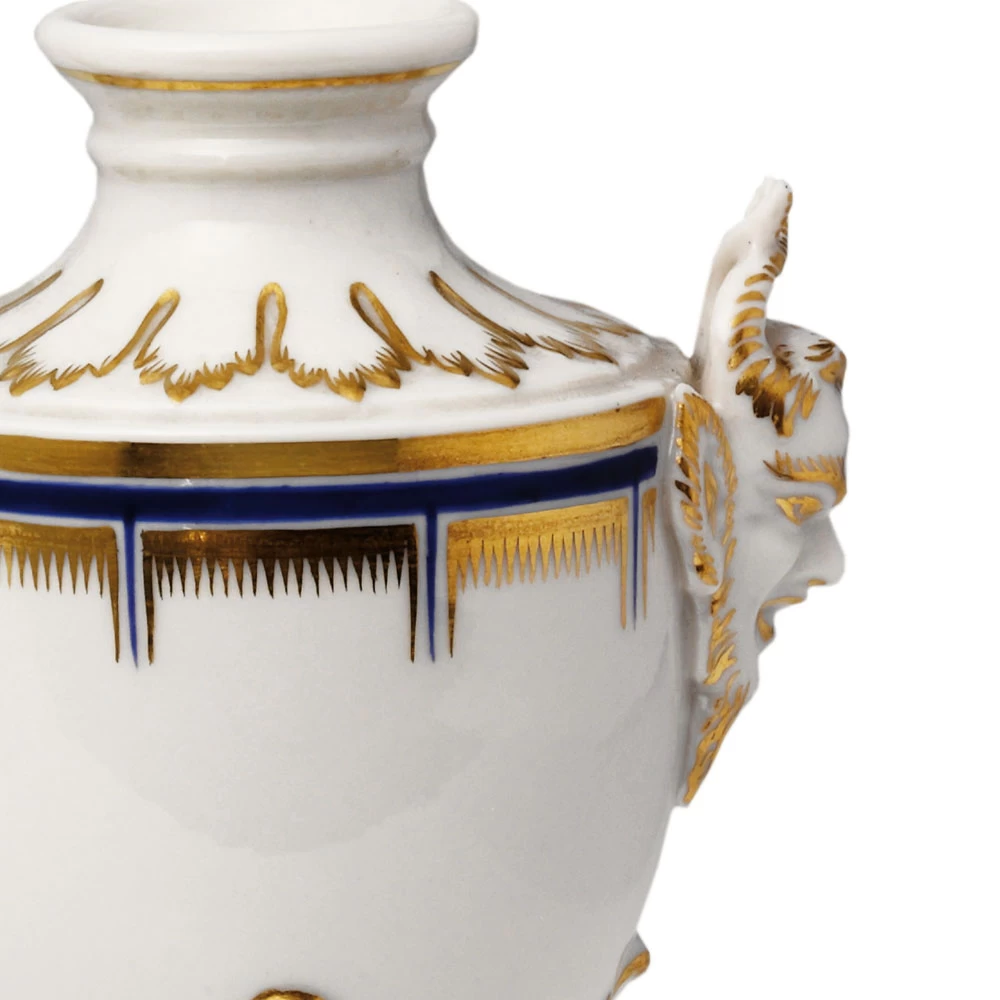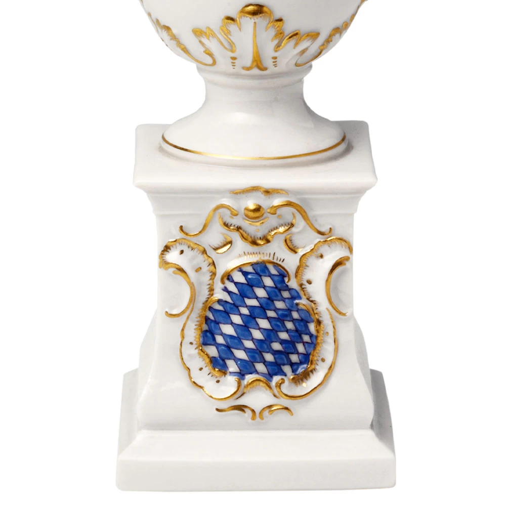 The classic form of this vase–that of an amphora on a pedestal–is brought to life by lavish adornments including Satyr Heads, acanthus-leaf reliefs and blue and gold decorations inspired by the royal Bavarian court. Hand painted porcelain with 24-carat gold accents. Established in 1747, Nymphenburg has–through its relentless commitment to craftsmanship and its sustained collaboration with the premier designers and artists of every era–solidified its position as one of the world’s finest creators of porcelain, serving generations of royalty and having its porcelain immortalized in museums and design collections. Kneen & Co. is proud to showcase and sell the largest selection of porcelain in North America.