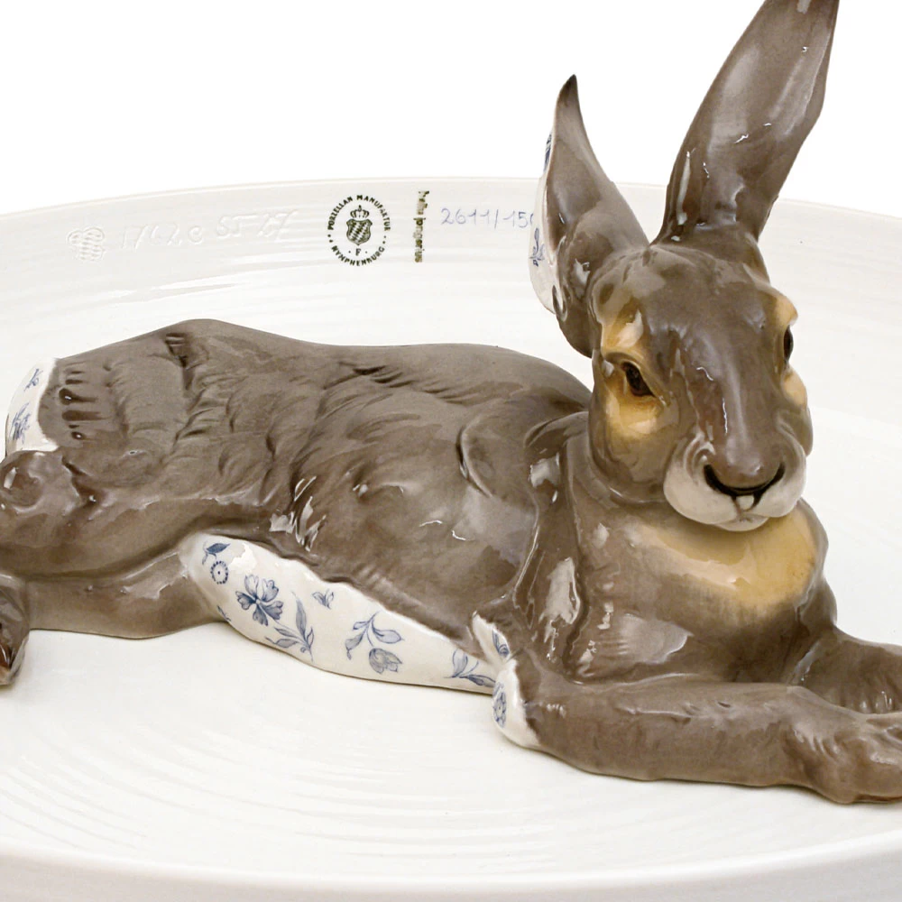 A placid grey hare turns to reveal a meticulously re-created textile pattern adorning its belly and ears. Part of Animal Bowl series, combining masterfully sculpted animal forms with tableware designs from the archives in a seamless blend of classic patterns, modern design and subtle humor. Hand painted porcelain with 24-carat gold accents. Established in 1747, has–through its relentless commitment to craftsmanship and its sustained collaboration with the premier designers and artists of every era–solidified its position as one of the world’s finest creators of porcelain, serving generations of royalty and having its porcelain immortalized in museums and design collections. Kneen & Co. is proud to showcase and sell the largest selection of porcelain in North America.