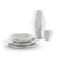 Inspired by the Far East, Argentinian designer, Ruth Gurvich created her Lightscape designs in collaboration with . Each piece was first molded in paper and then handcrafted in porcelain. White bisque porcelain with white glazed interior and artfully painted pencil marks.