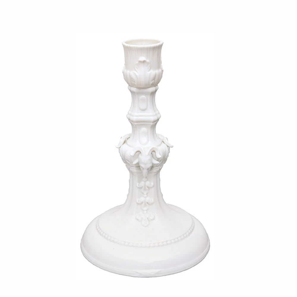 In this stately and luxurious candlestick, classically restrained pearl and acanthus leaf motifs frame three detailed rams’ heads. Porcelain with ivory glaze. Established in 1747, has–through its relentless commitment to craftsmanship and its sustained collaboration with the premier designers and artists of every era–solidified its position as one of the world’s finest creators of porcelain, serving generations of royalty and having its porcelain immortalized in museums and design collections. Kneen & Co. is proud to showcase and sell the largest selection of porcelain in North America.