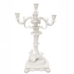Five candle-holding stems bloom forth from this richly sculpted foliage-themed candelabrum, detailed with twisting vines, butterflies and bunches of grapes, all atop a festooned architectural base. Porcelain with ivory glaze. Established in 1747, has–through its relentless commitment to craftsmanship and its sustained collaboration with the premier designers and artists of every era–solidified its position as one of the world’s finest creators of porcelain, serving generations of royalty and having its porcelain immortalized in museums and design collections. Kneen & Co. is proud to showcase and sell the largest selection of porcelain in North America.