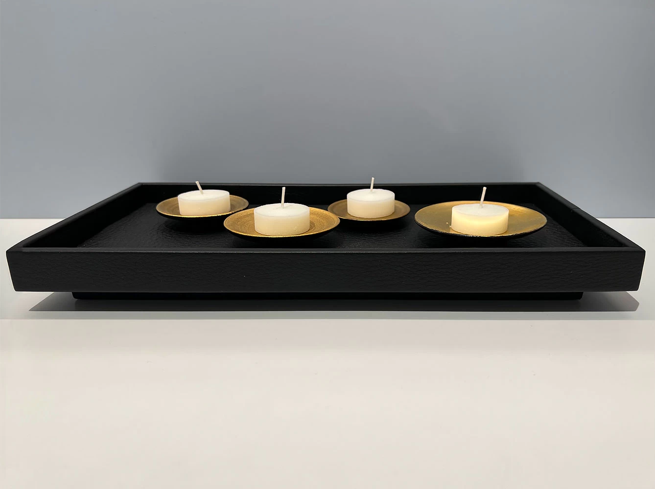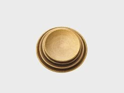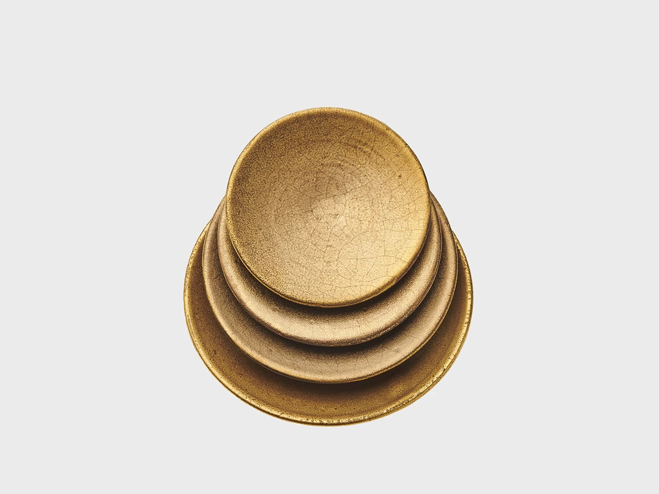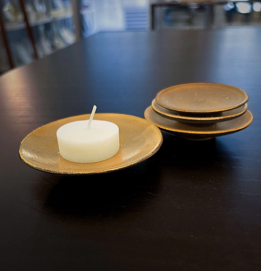 Crafted from black matt earthy terracotta with a 24 k gold finish, these Nymphenburg Terra Cotta Gold Mini Plates add a touch of glam to any setting. Each piece is unique and sizes will vary from 2.3 – 3.1 inches diameter. Used to hold your jewelry, votive lights or as decoration. Please note these are sold as individual units.