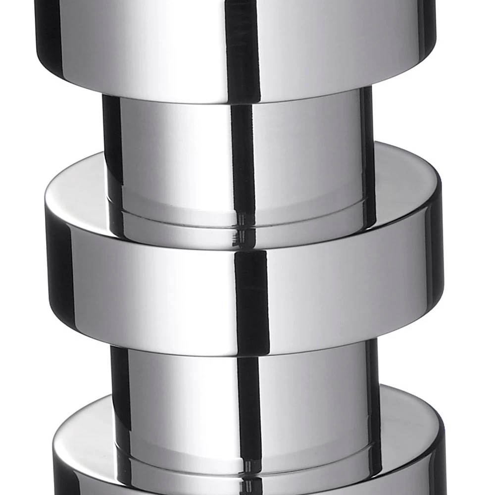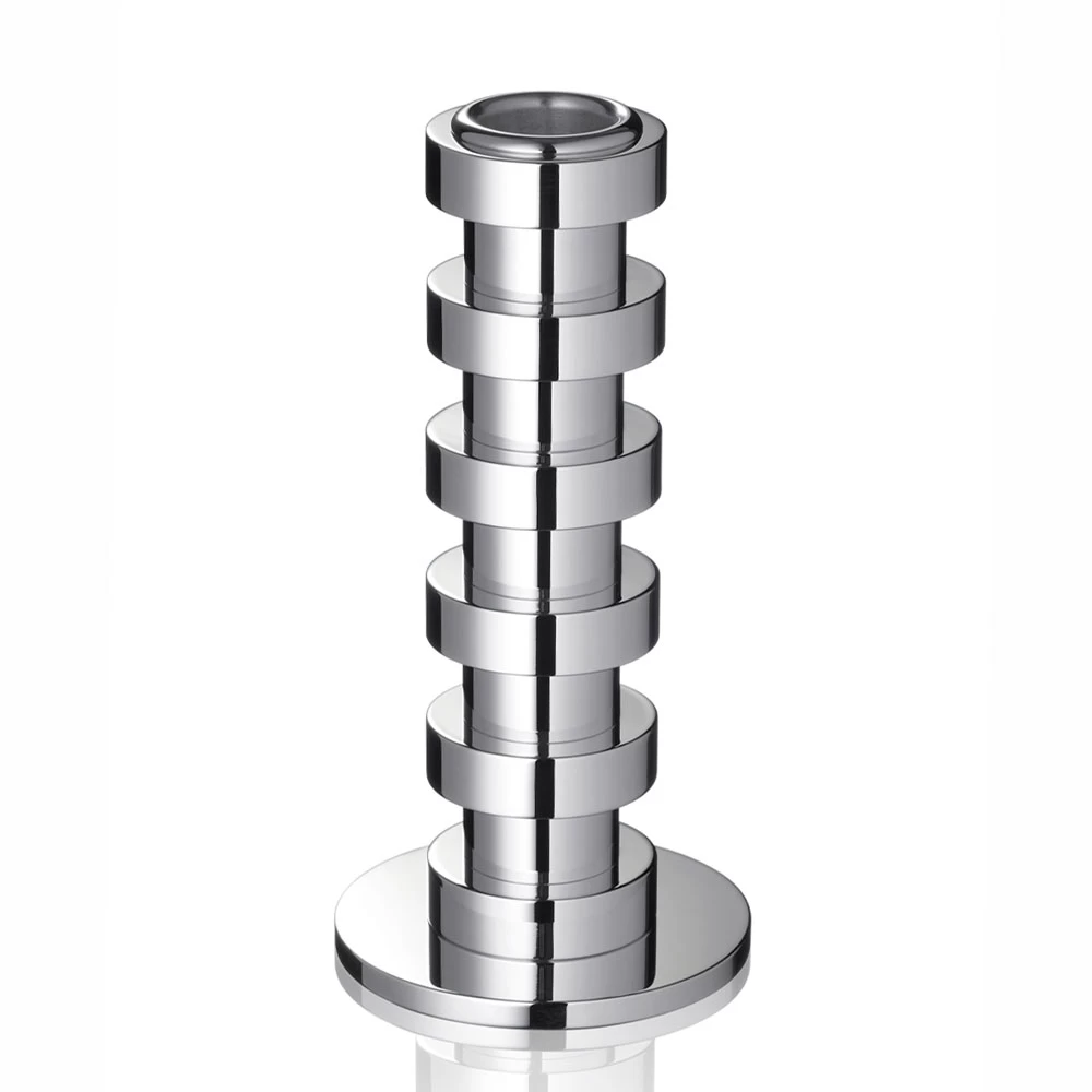 Stacked rings in brilliant silverplate give this candlestick both classic geometry and contemporary style.