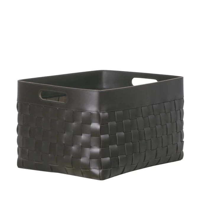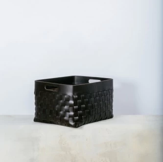 These woven saddle leather storage baskets have a range of sizes an shapes. The natural display of the weaves are to represent flowing waves. With more personality than just any storage piece, these items are handcrafted, handwoven and hand-stitched. See attached PDF for color options.
