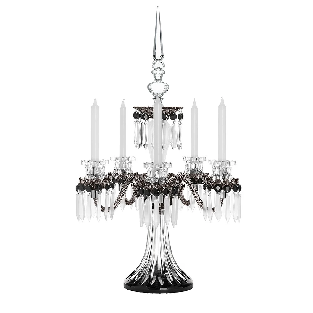 The Arlequin collection represents a stylish and lighthearted update of Saint-Louis’ timeless Classique line. Arlequin takes the opulence of Classique—with its lavish variety of shapes, forms and cuts—and gives it a fantastical twist of color. This combination of classic design and modern mischievousness, of refinement and boldness, creates a decorative mode that is truly new. Five twisted hollow flannel grey arms, crystal bowls with diamond cuts, clear crystal cones and cups with facet-cut clear crystal octagons.