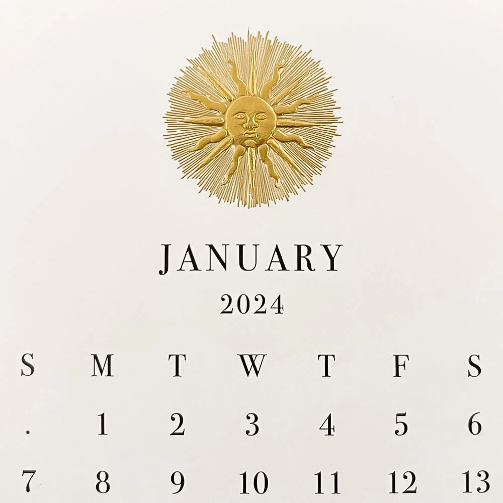 The Printery 2024 Calendar Refill on White Paper, Hand-Engraved in Black with Various Iconic Printery Motifs in Gold.