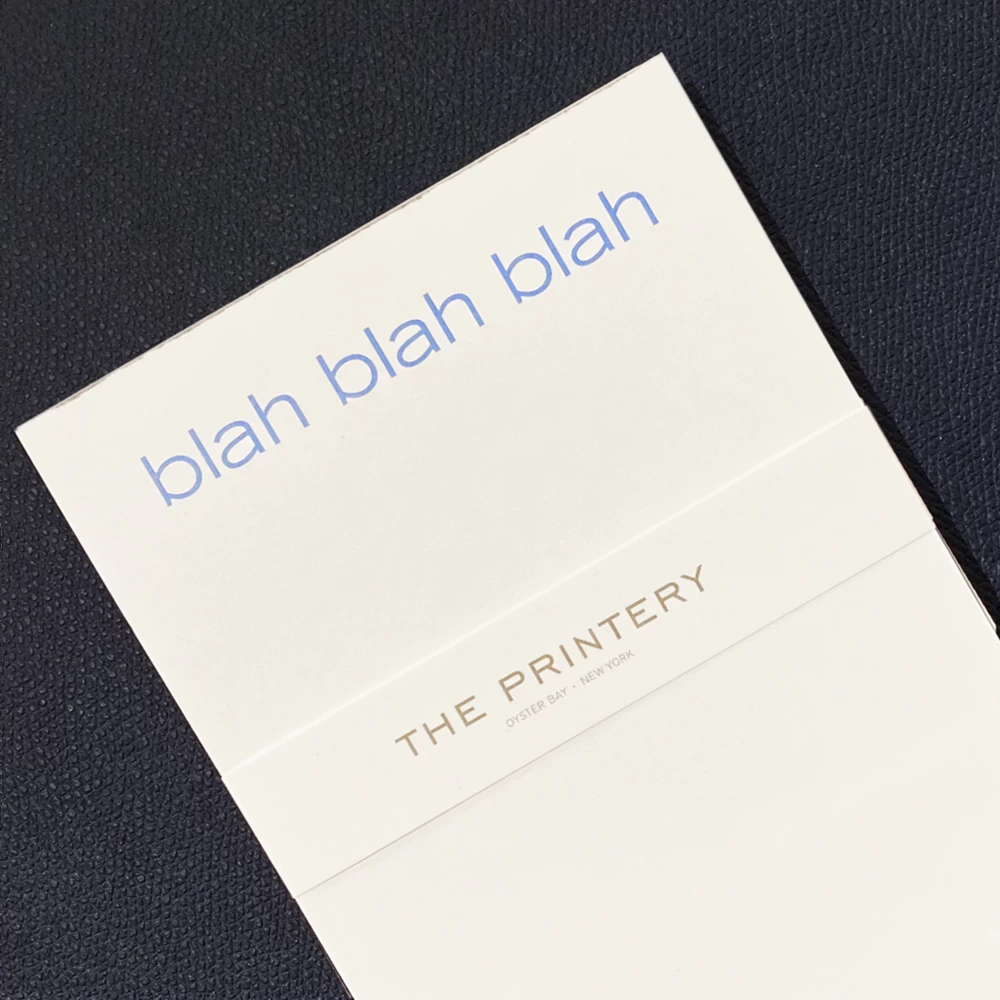 Note Pad on bone white paper with Blah Blah Blah text, in ness blue ink, flat printed. 50 sheets.