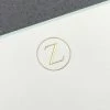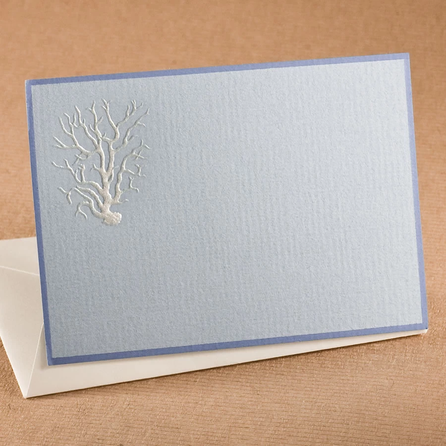 Engraved Luster White Coral on Powder Blue Card with Ness Blue Border and Envelope, package of 6. Impeccable craftsmanship is combined with bold colors and eye-catching design to give these classically constructed cards a contemporary energy. Photo by Paul Abbene for The Printery.