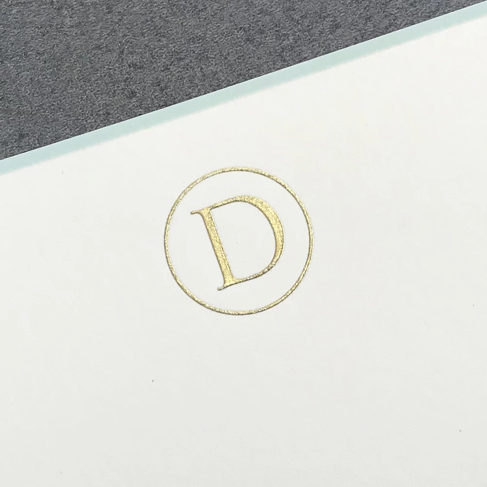 The Printery βDβ Initial Letter Note Cards are on ecru paper with an aqua border and initial letter in gold. The envelopes are lined with a shimmery gold tissue.