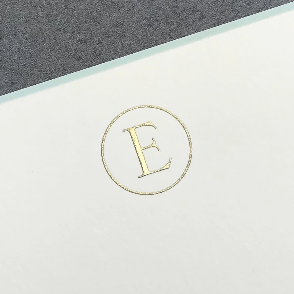 The Printery βEβ Initial Letter Note Cards are on ecru paper with an aqua border and initial letter in gold. The envelopes are lined with a shimmery gold tissue.