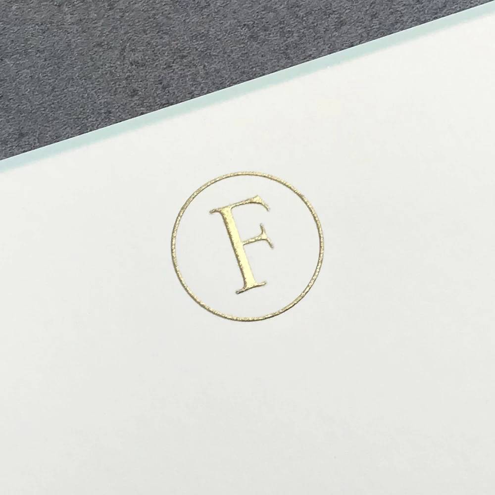 The Printery βFβ Initial Letter Note Cards are on ecru paper with an aqua border and initial letter in gold. The envelopes are lined with a shimmery gold tissue.