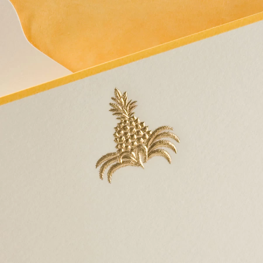 Engraved Gold Pineapple on Ecru Card with Sunflower Yellow Border and Sunflower Yellow Tissue Lined Envelope, box of 10. Impeccable craftsmanship is combined with bold colors and eye-catching design to give this classically constructed stationery a contemporary energy. Perfect for gift-giving or for adding flourish to your own correspondence. Photo by Paul Abbene for The Printery.