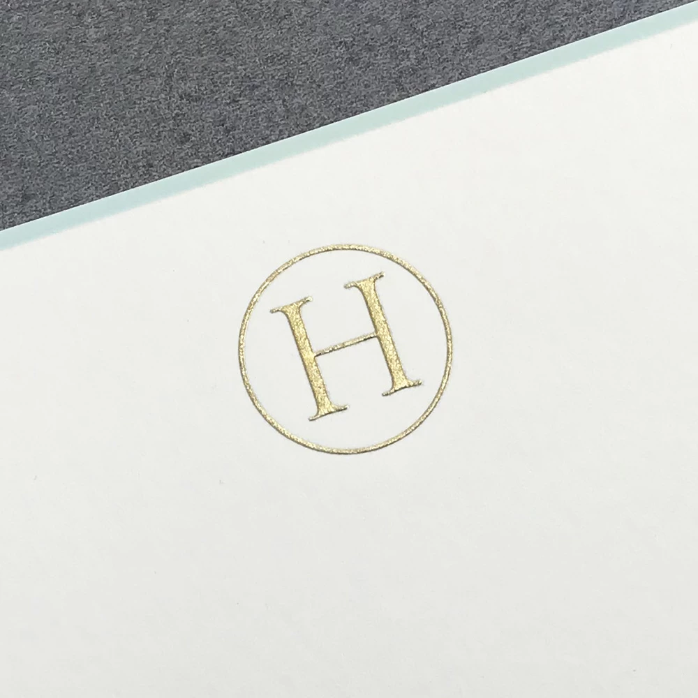The Printery βHβ Initial Letter Note Cards are on ecru paper with an aqua border and initial letter in gold. The envelopes are lined with a shimmery gold tissue.