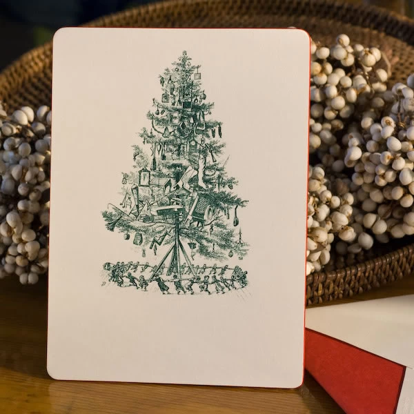 Ecru Embassy Club Engraved with Old-Fashioned Christmas Tree and Beveled in Red with Rounded Corners; Envelope Lined in Red Tissue, box of 10. Impeccable craftsmanship is combined with bold colors and eye-catching design to give these classically constructed cards a contemporary energy. Photo by Paul Abbene for The Printery.