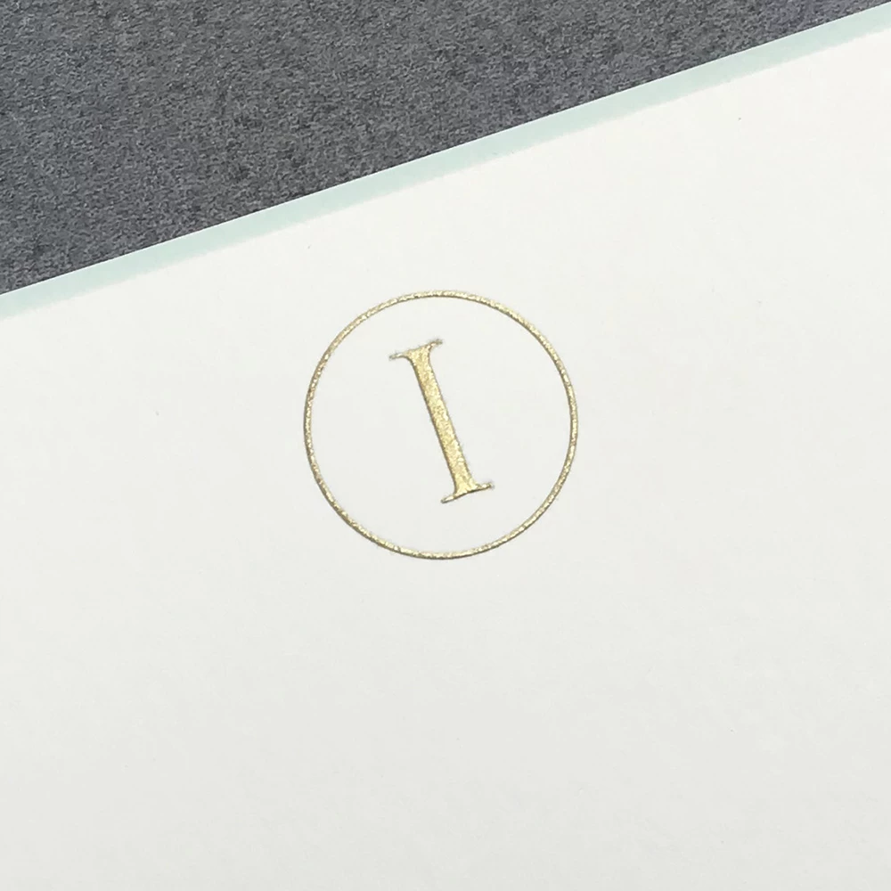 The Printery βIβ Initial Letter Note Cards are on ecru paper with an aqua border and initial letter in gold. The envelopes are lined with a shimmery gold tissue.