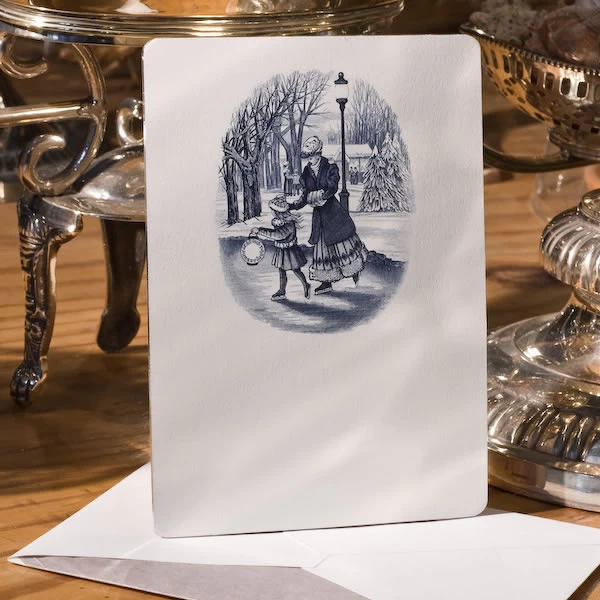 Bone White Embassy Holiday Card Engraved with Skaters in Midnight Blue and Beveled in Silver with Rounded Corners; Envelope Lined in Silver Tissue, box of 10. Impeccable craftsmanship is combined with bold colors and eye-catching design to give this classically constructed stationery a contemporary energy. Perfect for gift-giving or for adding flourish to your own correspondence. Photo by Paul Abbene for The Printery.