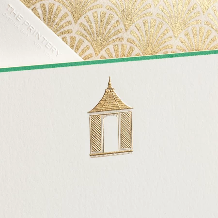 Gold Pergola on Horizontal Bone White Cards with Seagrass Green Borders and Envelopes Hand-Lined in Hand-Blocked Gold Patterned Paper, box of 10. Impeccable craftsmanship is combined with bold colors and eye-catching design to give this classically constructed stationery a contemporary energy. Perfect for gift-giving or for adding flourish to your own correspondence. Photo by Paul Abbene for The Printery