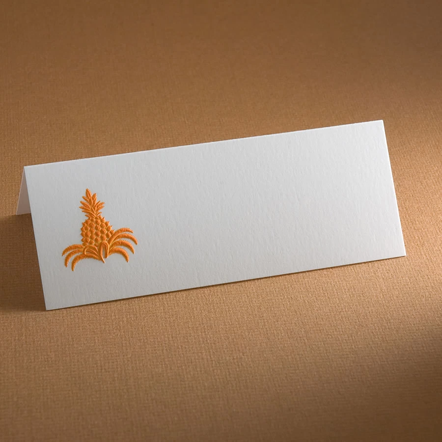Engraved Orange Pineapple on Bright White, package of 10. Impeccable craftsmanship is combined with bold colors and eye-catching design to give these classically constructed cards a contemporary energy. Photo by Paul Abbene for The Printery.
