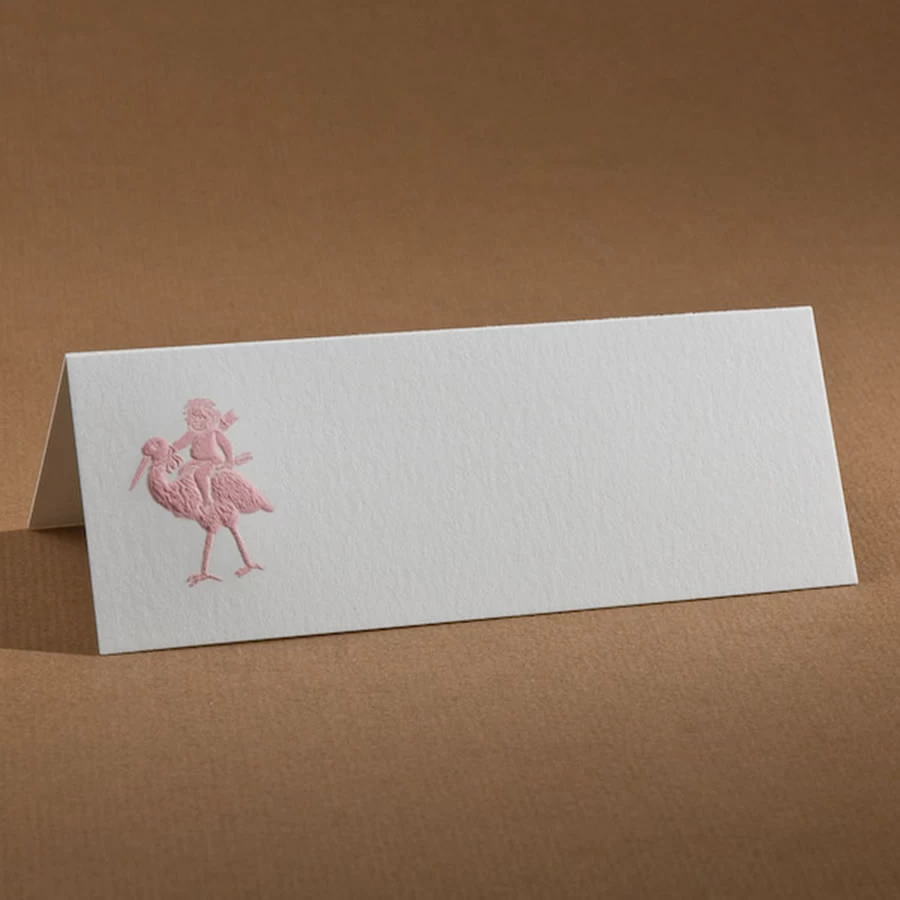 Engraved Stanton Pink Cherub & Stork on Bone White, package of 10. Impeccable craftsmanship is combined with bold colors and eye-catching design to give these classically constructed cards a contemporary energy.