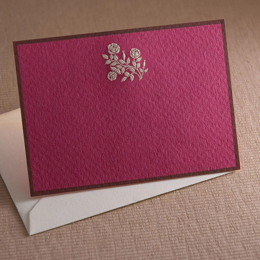 Engraved Cream Roses on Raspberry Card with Dark Brown Border and Envelope, package of 6. Impeccable craftsmanship is combined with bold colors and eye-catching design to give these classically constructed cards a contemporary energy.