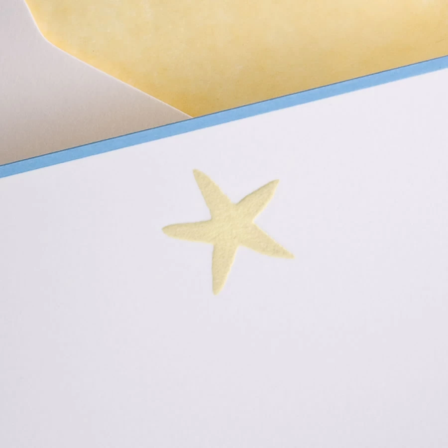 Engraved Cream Starfish on Bright White Card with Fenton Blue Border and Wheat Tissue Lined Envelope, box of 10. Impeccable craftsmanship is combined with bold colors and eye-catching design to give this classically constructed stationery a contemporary energy. Perfect for gift-giving or for adding flourish to your own correspondence.