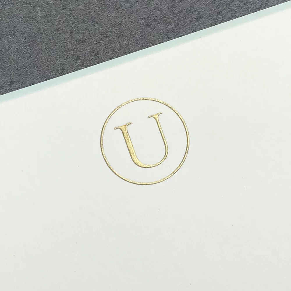 The Printery βUβ Initial Letter Note Cards are on ecru paper with an aqua border and initial letter in gold. The envelopes are lined with a shimmery gold tissue.