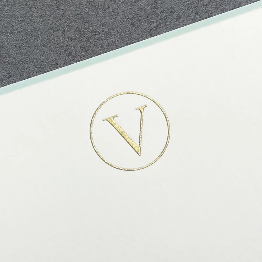The Printery βVβ Initial Letter Note Cards are on ecru paper with an aqua border and initial letter in gold. The envelopes are lined with a shimmery gold tissue.