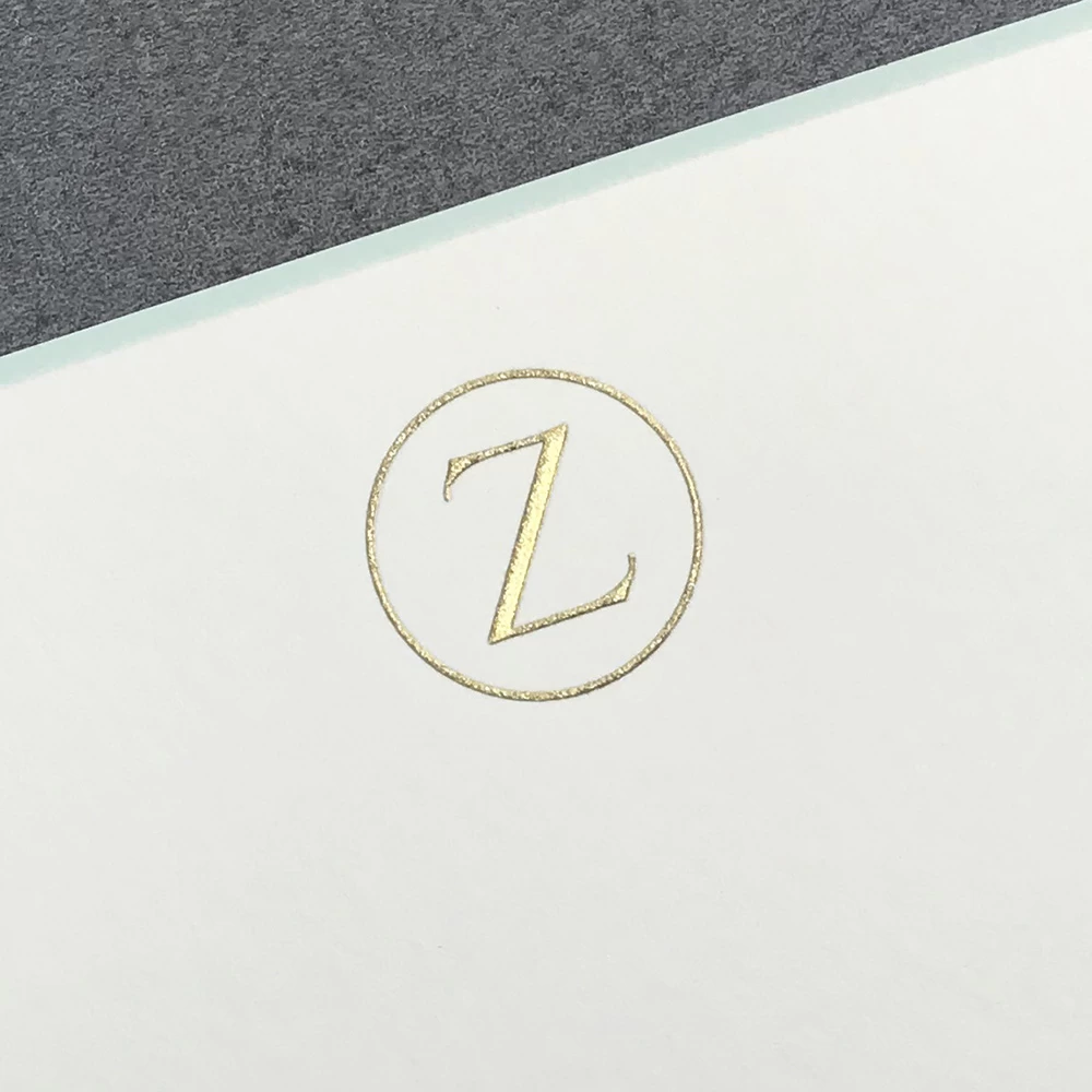 The Printery βZβ Initial Letter Note Cards are on ecru paper with an aqua border and initial letter in gold. The envelopes are lined with a shimmery gold tissue.