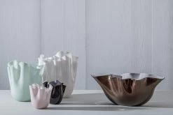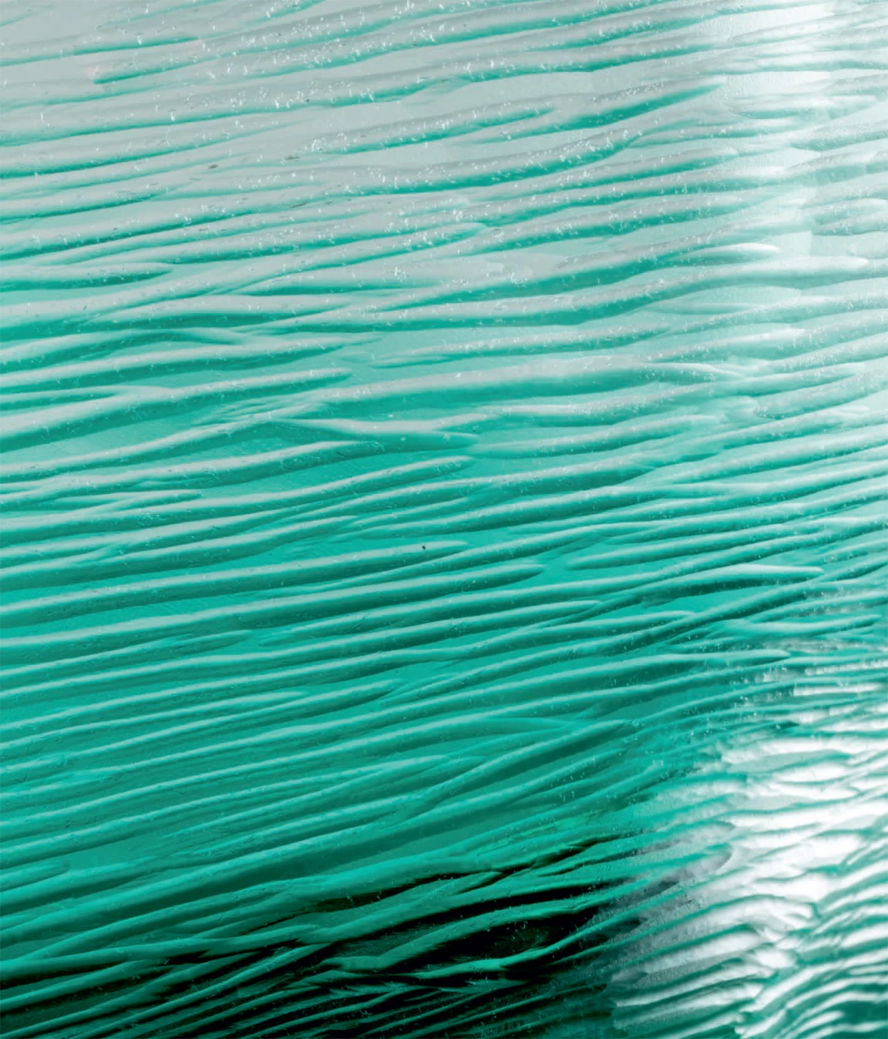 The Acqua Textured collection takes its inspiration from nature in Japan. The collection consists of a Bud Vase, Water Vase, and Tea Container. Their soft sinuous shapes are symbolic of pebbles while their striking texture recalls water flowing in a mountain stream. The delicate color is most intense where the glass is its thickest, becoming paler and paler until crystal clear. Designed by Michela Cattai for Venini in 2019. Hand-crafted from mouth-blown Murano glass, Acqua Textured is a limited edition of 19 art pieces each.