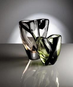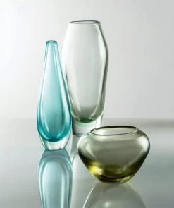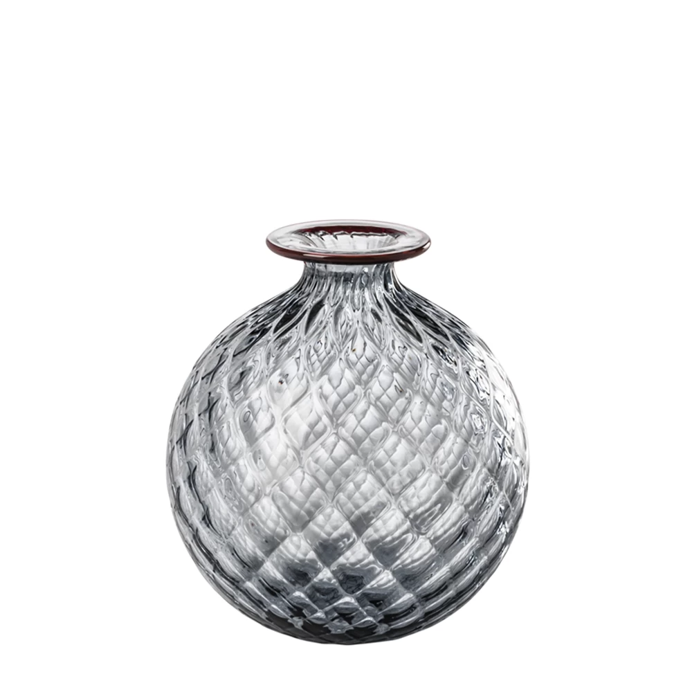 Venini Monofiore Balloton Vases beautifully display the Balloton technique through their unique texture and sparkle. During the glass blowing process, hot glass is pressed into a metal mold that imprints the glass with a crossed relief effect. Each vase is then adorned with a colored glass thread around the lip of the vase. These hand-blown Murano glass vases were first designed in 1970 then brought back to production in 2016.