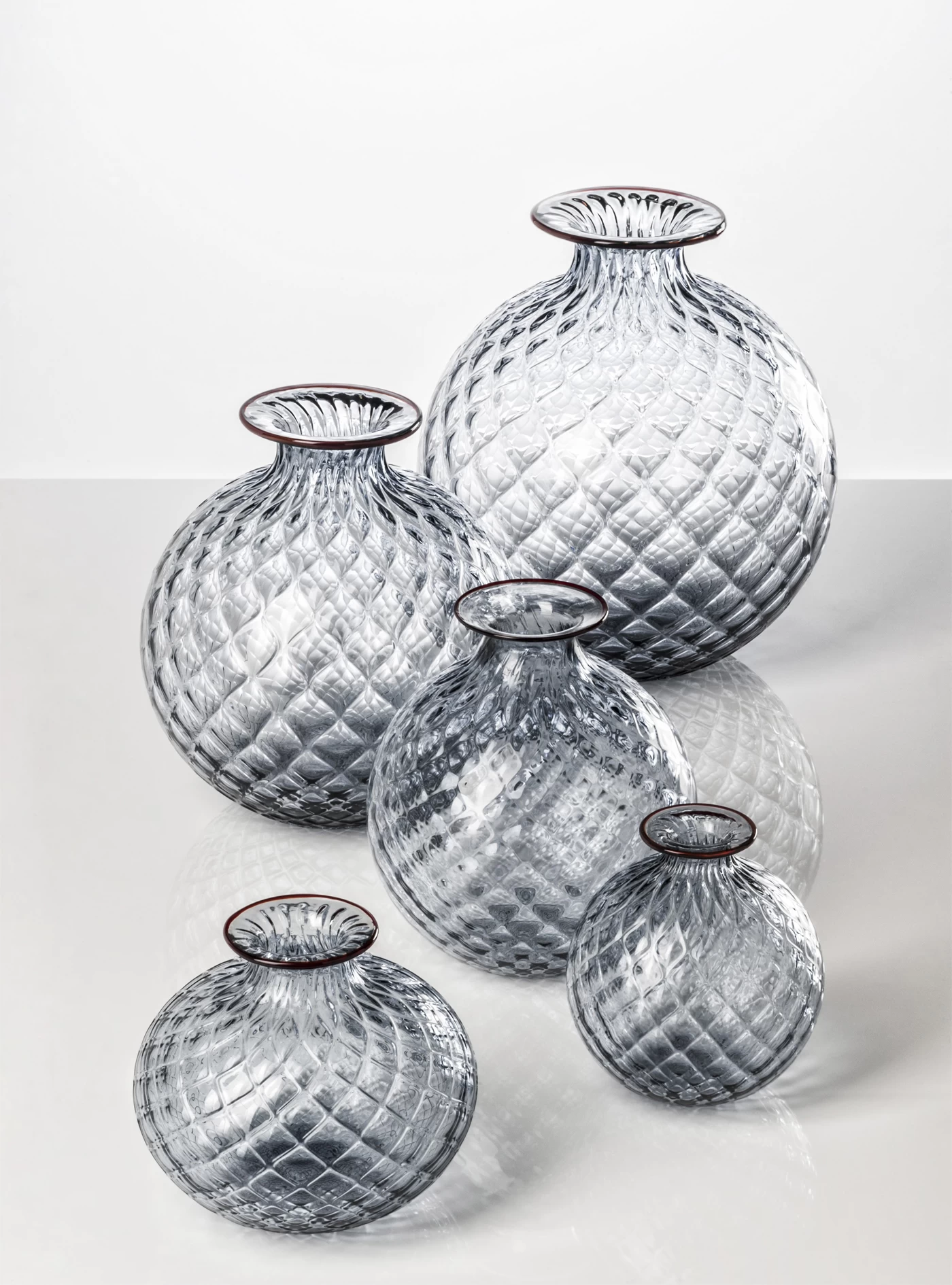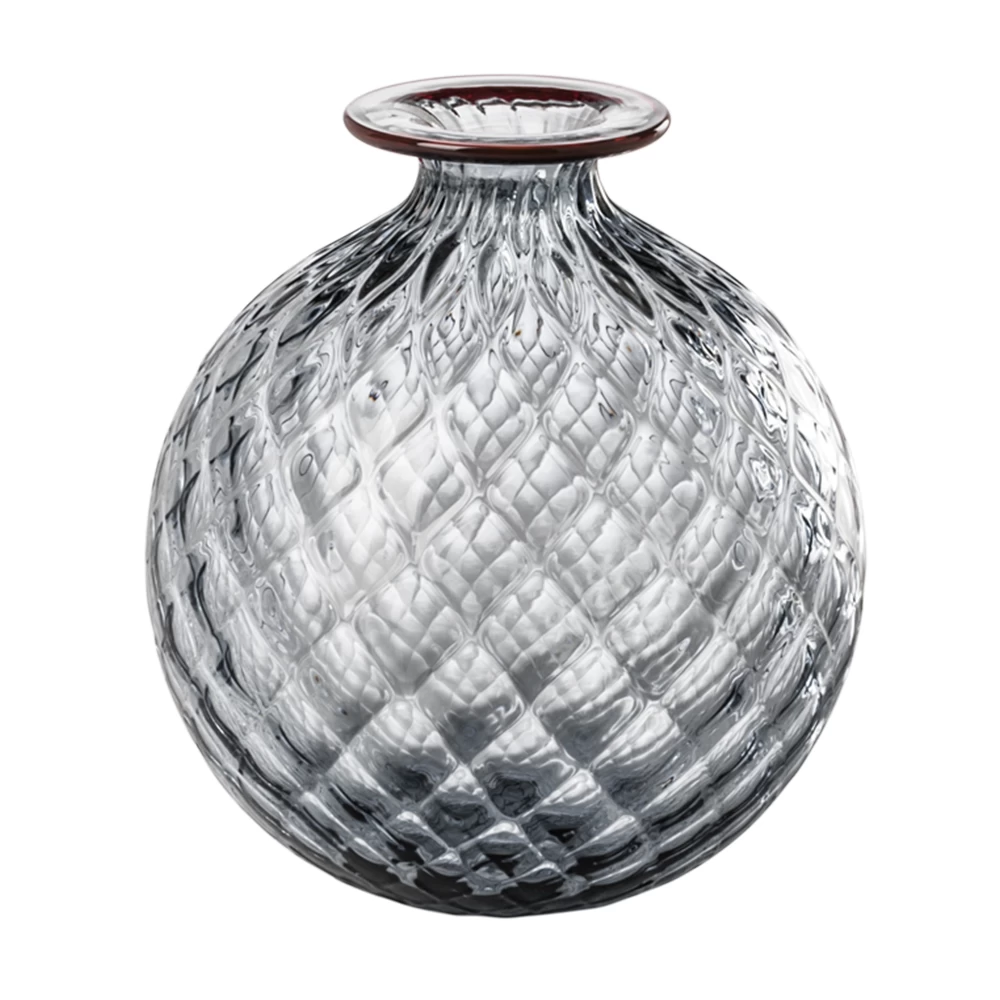 Venini Monofiore Balloton Vases beautifully display the Balloton technique through their unique texture and sparkle. During the glass blowing process, hot glass is pressed into a metal mold that imprints the glass with a crossed relief effect. Each vase is then adorned with a colored glass thread around the lip of the vase. These hand-blown Murano glass vases were first designed in 1970 then brought back to production in 2016.