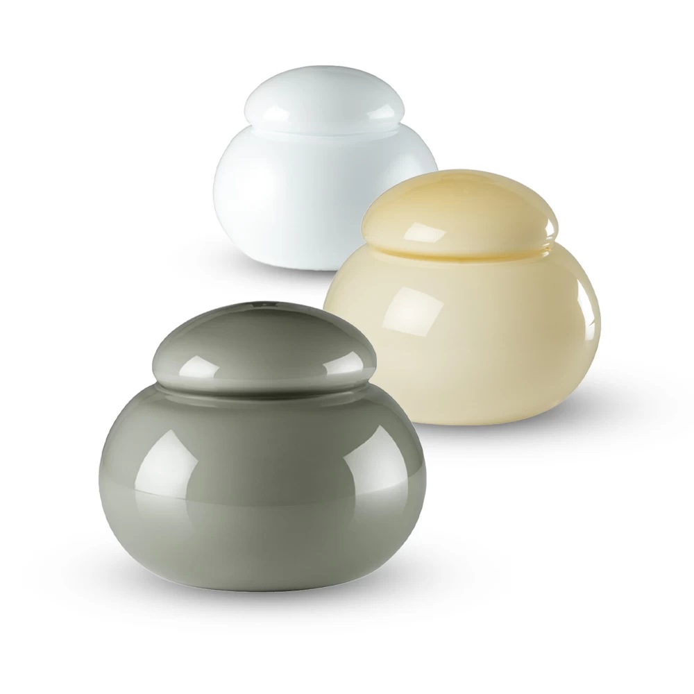 Venini Potiche is the perfect round glass box to store small items. Composed of a base and a lid, both with a rounded profile. Made from hand-blown opalino glass. Available in Milk-White, Grey, or Straw-Yellow.